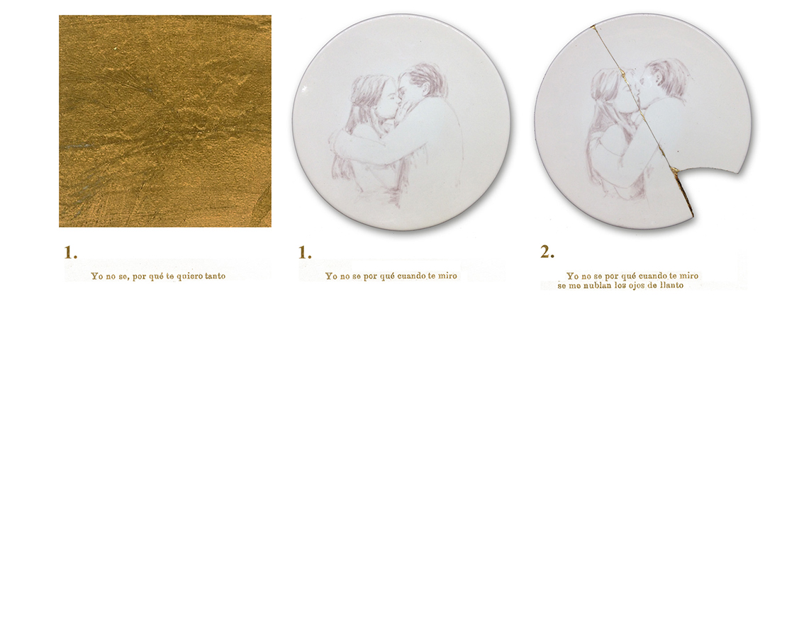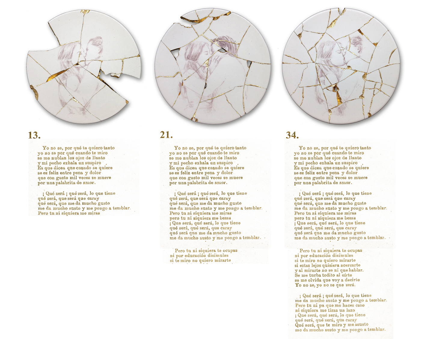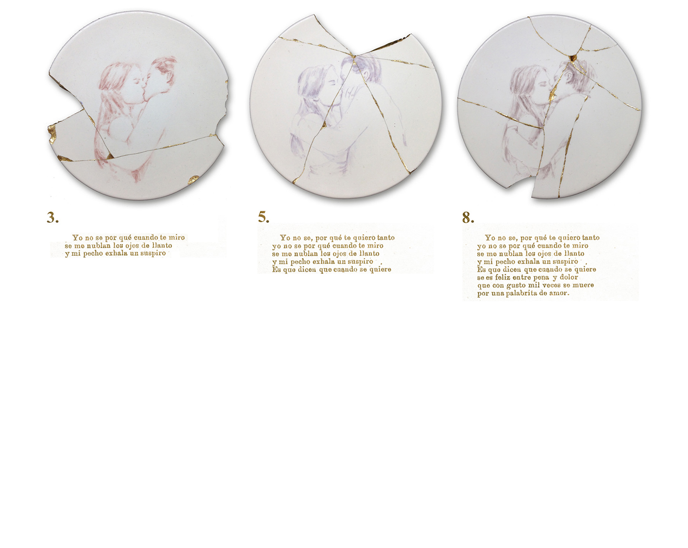 En 8 etapas recorremos el desmembramiento de un suceso: la figura genérica de un beso vuelta linea es quebrada: en movimiento. Se nos presenta el dorado que suturará, y luego el plato entero se va disgregando en fragmentos que responden a la suma de los fragmentos que va dejando en el camino. De esta forma el caos se ordena, terminando la secuencia con un desastre donde el beso queda surcado por tantas cicatrices, tantas como versos contiene el texto que le acompaña, el cual a modo de deconstrucción, va apareciendo a medida que el beso va desapareciendo: mientras más piezas acumula la fractura, más lineas podemos leer de esta evocación (una canción mexicana olvidada). Es este descalce el que otorga tiempo; es ahí donde el espectador ve el desgaste y lo inevitable: el punto donde más que beso veremos cicatrices.