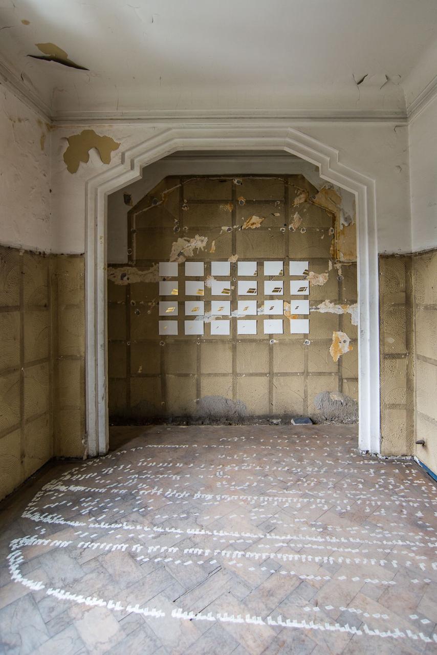 23 de septiembre: el día del año en cual el sol alumbra durante más tiempo. A las 8:53 la luz comienza a tocar el piso de esta habitación. La abandona a las 13:09. Mediante marcas se fue registrando cada 4 minutos la forma proyectada por la luz a través de la ventana. El resultado es un mapeo absurdo del movimiento del sol en un periodo de 4 horas. No sirve de nada. Tomando como referencia 24 momentos de este mapeo, indicados por las marcas doradas, se proyectan 24 dibujos: con láminas de oro se arman 24 formas dejadas por el sol en el piso de la habitación. Los muros, dibujados con punzón en el papel, sostienen el aire, lo invertebrado. Las formas se mueven circulares, silenciosas. 4 horas de movimiento o 4 horas de inmovilidad. El aburrimiento es la ilusión de que todo está estático. Si nos quedamos quietos podemos ver todo moverse.